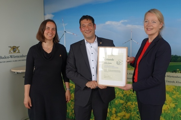 Bild: Umweltministerin Thekla Walker, MdL (rechts) überreicht im Umweltministerium in Stuttgart die Siegerurkunde des Landeswettbewerbs „Auf dem Weg zur Klimaneutralität“ für Vorreiter-Kommunen aus Baden-Württemberg an den Denzlinger Bürgermeister Markus Hollemann (Mitte) und Denzlingens Klimaschutzmanagerin Diana Sträuber (links).