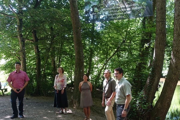 Unauffällig begleiten „Waldimpulse“ Spaziergänger durch den Denzlinger Wald. Neben Bürgermeister Markus Hollemann sowie dem stellvertretenden Leiter des Forstamts Emmendingen Dr. Frieder Hepperle und Revierförster Bernd Nold, erschienen auch Anne-Kathrin Uehlin-Mick als pädagogische Leiterin und Ilka Döring als zweite Vorsitzende des Trägervereins „Aktion Lebensraum“ zur Einweihung des ca. zwei Kilometer langen Rundweges. Der Rundweg ist mit dezent gestalteten Transparenten geschmückt, welche mit Inschriften namhafter Persönlichkeiten wie Joseph Cornell oder Albert Einstein bedruckt sind. Der Spaziergang durch den Wald soll zum Meditieren und Verweilen anregen, mehr noch, er soll ein Ort sein, an dem man viele Sorgen und Ängste abladen könnte. „Insbesondere die vergangenen Wochen und Monate während der Corona-Pandemie zeigten, wie wertvoll der Wald als Zufluchts- und Rückzugsort ist“, so Bürgermeister Hollemann – Durch den Rundweg, welcher in dieser Form voraussichtlich bis zum Ende der Sommerferien bestehen wird, soll dieser Wert noch weiter in das Bewusstsein der Mitbürgerinnen und Mitbürger gerückt werden, berichtet Dr. Frieder Hepperle. Der Rundweg beginnt am Waldspielplatz Einbollen und folgt dem Dachslöcher-, und dem Wiesenweg. V.l.n.r. Markus Hollemann (Bürgermeister), Ilka Döring (zweite Vorsitzende Aktion Lebensraum e.V), Anne-Kathrin Uehlin-Mick (pädagogische Leiterin Aktion Lebensraum e.V.), Revierförster Bernd Nold und der stellvertretende Amtsleiter Dr. Frieder Hepperle; Foto: Gemeinde Denzlingen