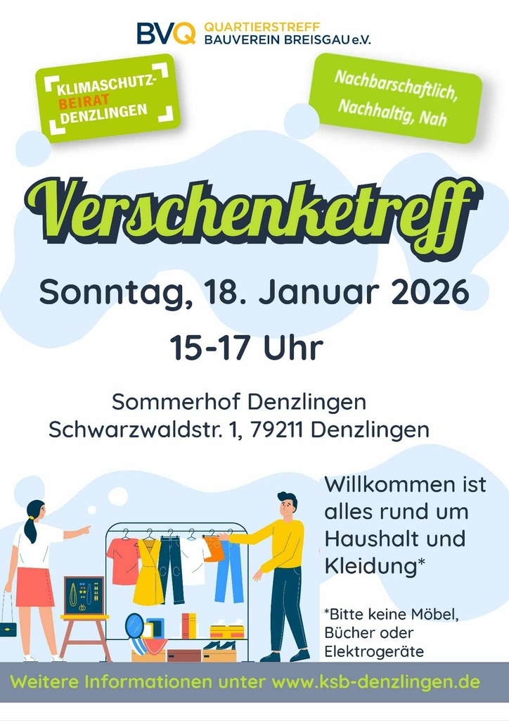So, 18. Januar 2026 | 15:00 Uhr - 17:00 UhrVerschenketreffDer Klimaschutzbeirat Denzlingen veranstaltet wieder einen Verschenketreff im Quartierstreff Sommerhof, Schwarzwaldstraße 1, Denzlingen.