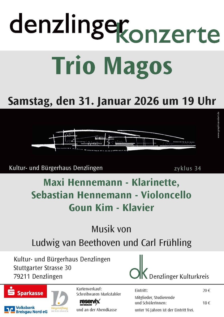 Sa, 31. Januar 2026 | 19:00 Uhr - 21:00 UhrKonzert - Trio Magos Der Name Trio Magos (span. die Zauberer) ist nicht nur eine Zusammensetzung aus den Vornamen seiner Mitglieder Maxi Hennemann, Goun Kim und Sebastian Hennemann, sondern auch ein Sinnbild für die musikalische Identität des Ensembles. Die drei jungen Musikerinnen und Musiker sind ständig auf der Suche nach neuen Farben, Nuancen und musikalischen Ausdrucksformen, die die besondere Besetzung des Trios aus Klarinette, Violoncello und Klavier bietet und mit denen Sie ihr Publikum bezaubern.