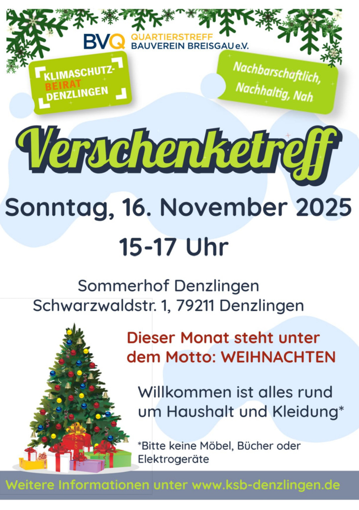 So, 16. November 2025 | 15:00 Uhr - 17:00 UhrVerschenketreffDiesen Sonntag, den 16.11. von 15 – 17 Uhr, veranstaltet der Klimaschutzbeirat Denzlingen wieder einen Verschenketreff im Quartierstreff Sommerhof, Schwarzwaldstraße 1, Denzlingen.