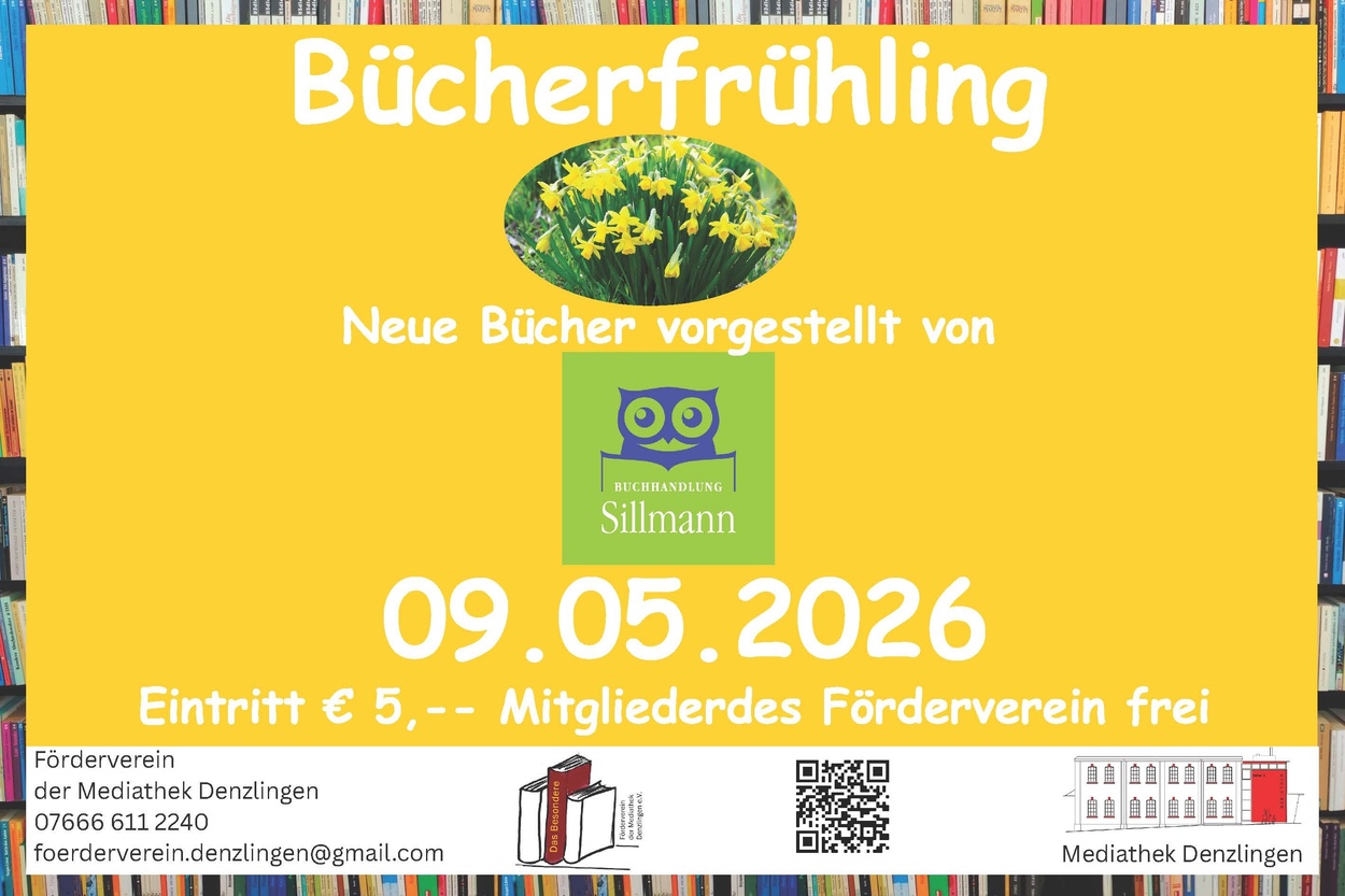Do, 23. April 2026 - Do, 23. April 2026 | 19:30 Uhr - 21:30 UhrBücherfrühlingLeseempfehlungen für die ersten warmen Sonnenstrahlen gibt es beim Bücherfrühling in der Mediathek Denzlingen Dort kann man auf Einladung des Fördervereins der Mediathek die frühlingshaften Neuerscheinungen entdecken. Das Team der Buchhandlung Sillmann stellt eine bunte Mischung an Literatur vor, die den Frühling schöner machen. Der Förderverein sorgt für den gemütlichen Rahmen. Karten zu 5€ gibt es an der Abendkasse, Mitglieder des Fördervereins der Mediathek genießen freien Eintritt.