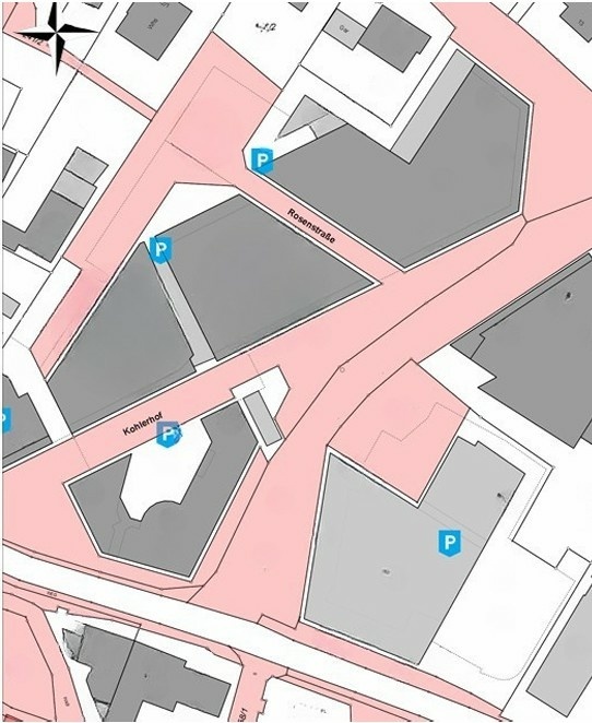 Dabei darf gerne größer gedacht werden als nur die Rosenstraße: Die Ortsmitte umfasst viele Orte und Möglichkeiten – wie rot markiert auf der Grafik zu sehen. Neue Perspektiven und kreative Nutzungen sind ausdrücklich willkommen.